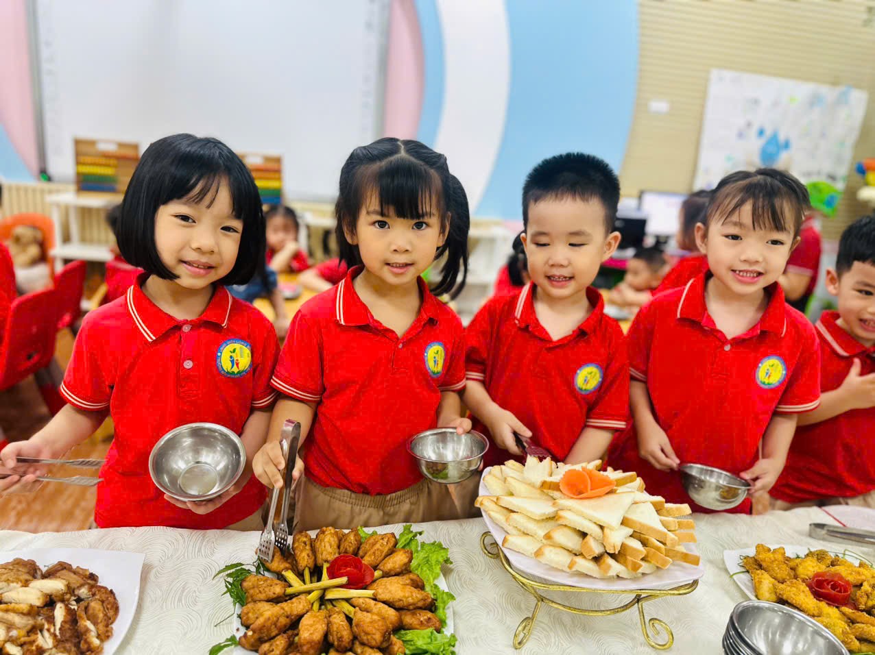 Sáng sớm hôm nay, các cô bác trong nhà trường đã đến thật sớm để chuẩn bị cho buổi tiệc của các con. Các bác đầu bếp tài ba đã trực tiếp chế biến những món ăn hấp dẫn, nóng hổi, đầy đủ dinh dưỡng, đảm bảo vệ sinh ATTP và được trang trí, sắp xếp đẹp mắt, thẩm mỹ, chắc chắn các bé học sinh sẽ thích mê. Những món ăn mới hấp dẫn, đầy đủ dưỡng chất, hợp khẩu vị, khiến bé nào cũng rất háo hức và hứng thú tham gia. Trong bữa tiệc buffet, các bé không chỉ được ăn ngon, được giao lưu mà còn được cô giáo hướng dẫn kĩ năng ăn tiệc phù hợp, văn minh, lịch sự, đúng chuẩn những em bé hiện đại và thanh lịch.