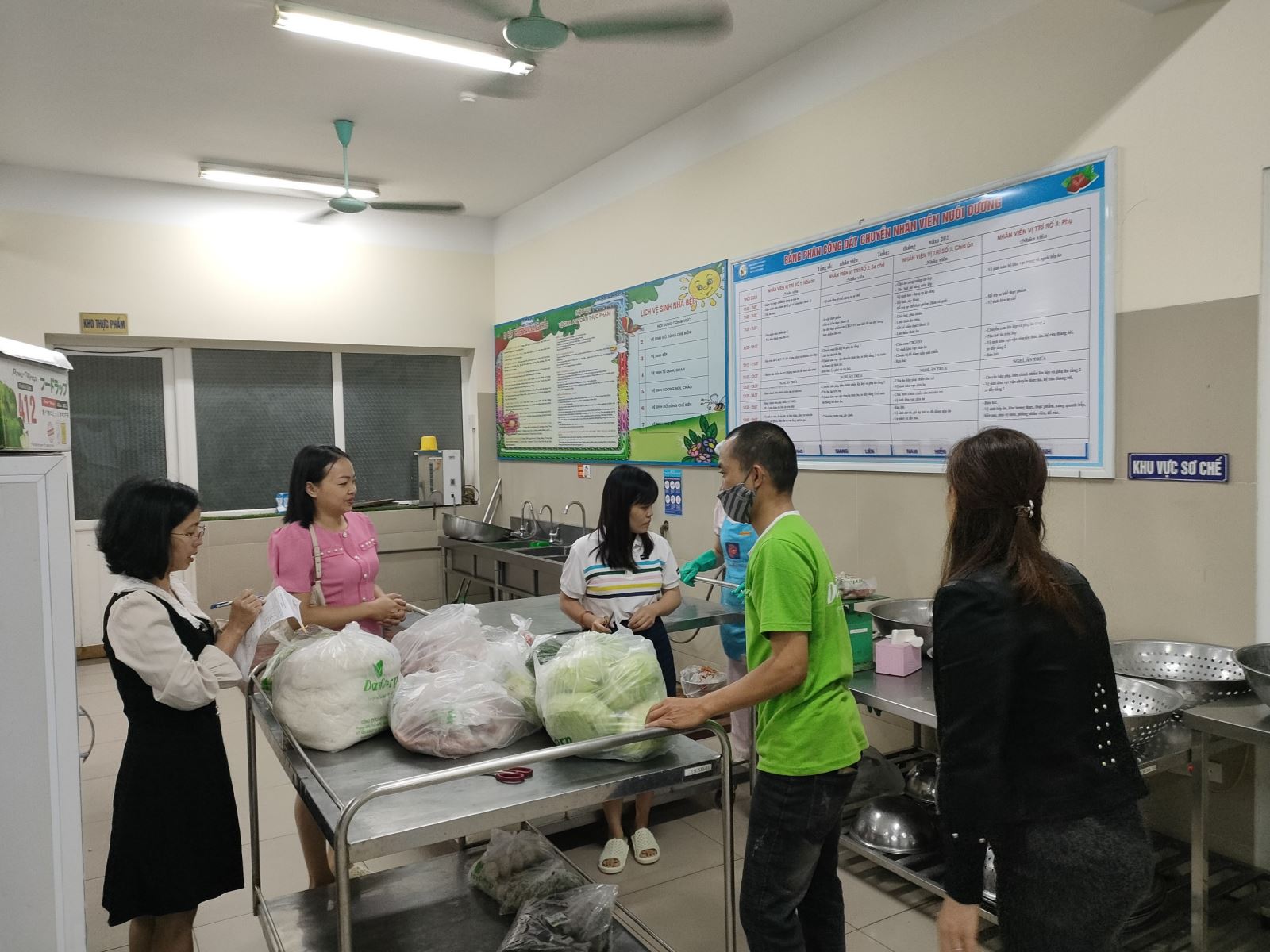 Sáng ngày 24/11/2022 nhà trường đã mời đại diện các bậc phụ huynh khối mẫu giáo bé đến kiểm tra giám sát. Buổi kiểm tra giao nhận thực phẩm diễn ra theo đúng quy trình một chiều, thực phẩm tươi ngon, đúng số lượng, đảm bảo chất lượng, vệ sinh an toàn thực phẩm. Toàn bộ thực phẩm được đóng gói cẩn thận, có đầy đủ tem nhãn, ngày sản xuất, hạn sử dụng, có dấu xác nhận kiểm dịch thú y. Trang bị bảo hộ lao động đầy đủ theo quy định, đồ dùng chế biến thực phẩm sạch sẽ, an toàn, nhà bếp gọn gàng, ngăn nắp. Phụ huynh yên tâm và tin tưởng về nguồn thực phẩm cung cấp cho nhà trường luôn đảm bảo về chất lượng và vệ sinh ATTP. Sau buổi kiểm tra giao nhận các cô chú đầu bếp lại bắt tay vào công việc sơ chế, chế biến các món ăn theo đúng quy định, chia ăn đến từng lớp đảm bảo cung cấp những món ăn đầy đủ dinh dưỡng và calo cho các con, giúp các con phát triển khỏe mạnh.