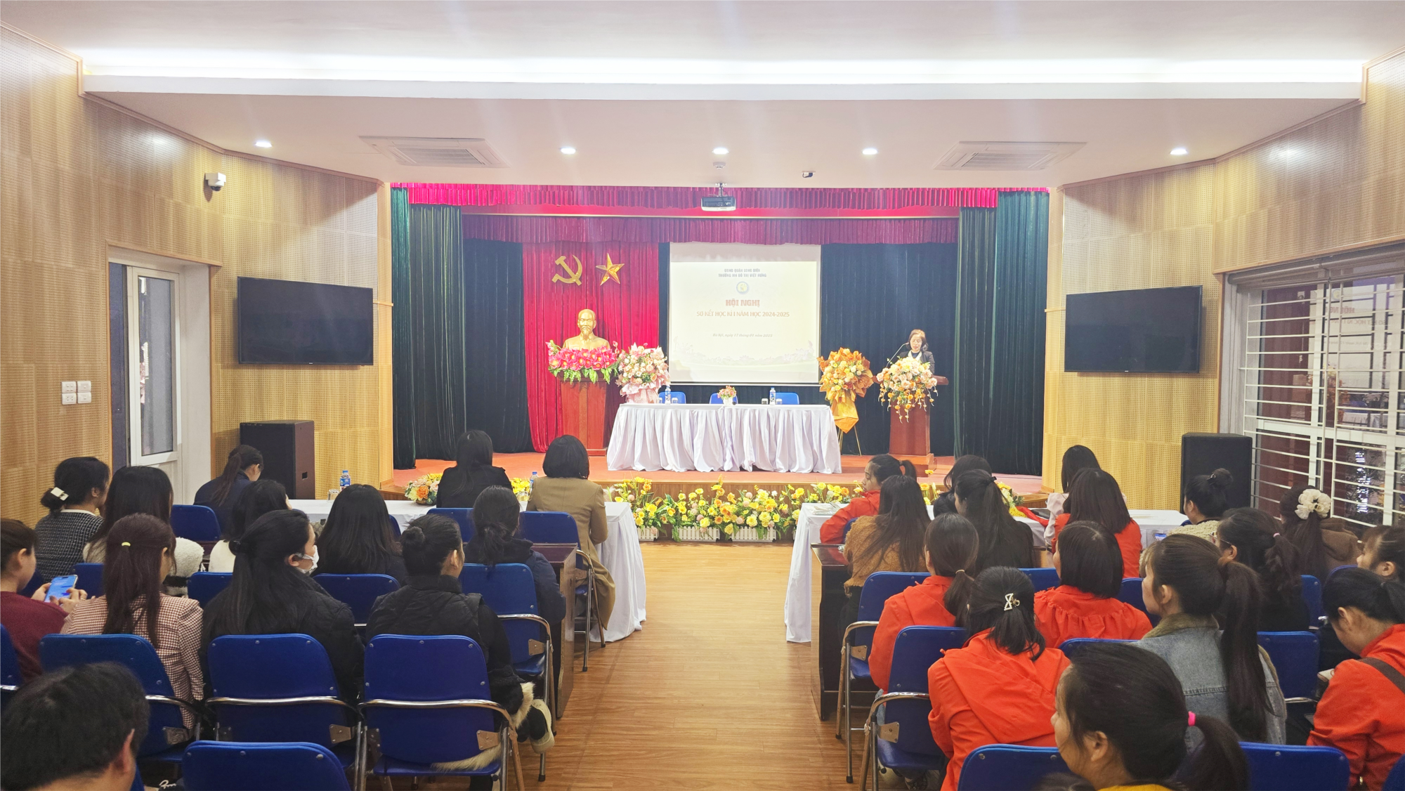 Tại buổi hội nghị đồng chí Trần Thị Hoàng Lâm – Bí thư chi bộ – Hiệu trưởng nhà trường đã thông qua báo cáo sơ kết học kỳ I năm học 2024-2025. Trong báo cáo, đồng chí đã biểu dương những thành tích mà nhà trường đã đạt được trong học kỳ vừa qua. Đồng thời, đưa ra phương hướng, mục tiêu, nhiệm vụ mà nhà trường sẽ tiếp tục cố gắng, phấn đấu trong học kỳ tới. Và mong rằng với sự đoàn kết của tập thể, chung sức đồng lòng, quyết tâm vượt khó của đội ngũ CBGVNV. Nhà trường sẽ tiếp tục gặt hái được nhiều thành quả hơn nữa trong công tác dạy và học của nhà trường.