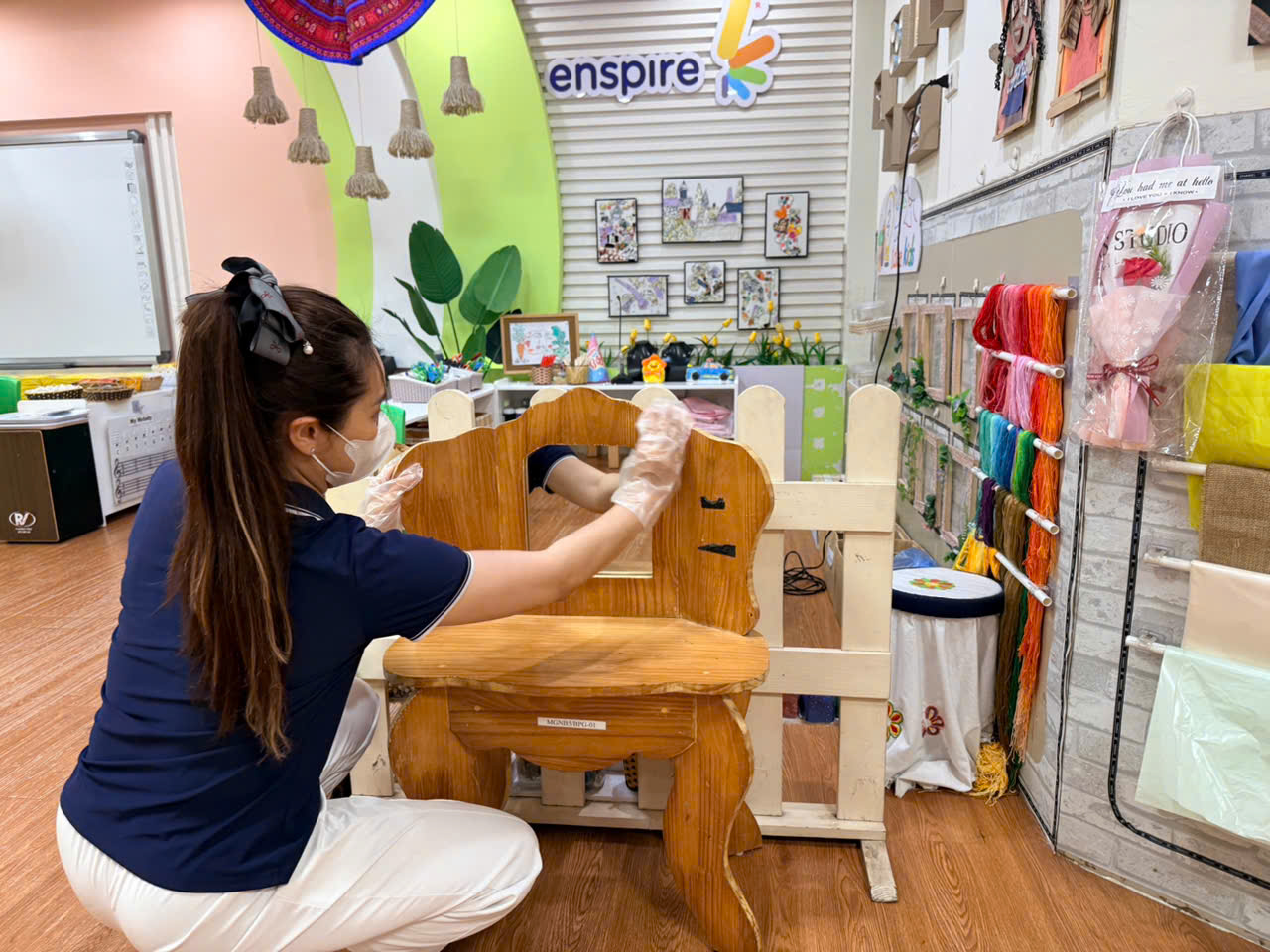 Tập thể giáo viên và nhân viên nhà trường đã tỉ mỉ sát khuẩn toàn bộ sàn nhà, tay nắm cửa, bàn ghế và các thiết bị dạy học. Đặc biệt, hệ thống đồ dùng, đồ chơi của các con đều được ngâm rửa và khử trùng kỹ lưỡng, đảm bảo an toàn tuyệt đối khi trẻ tiếp xúc hàng ngày.