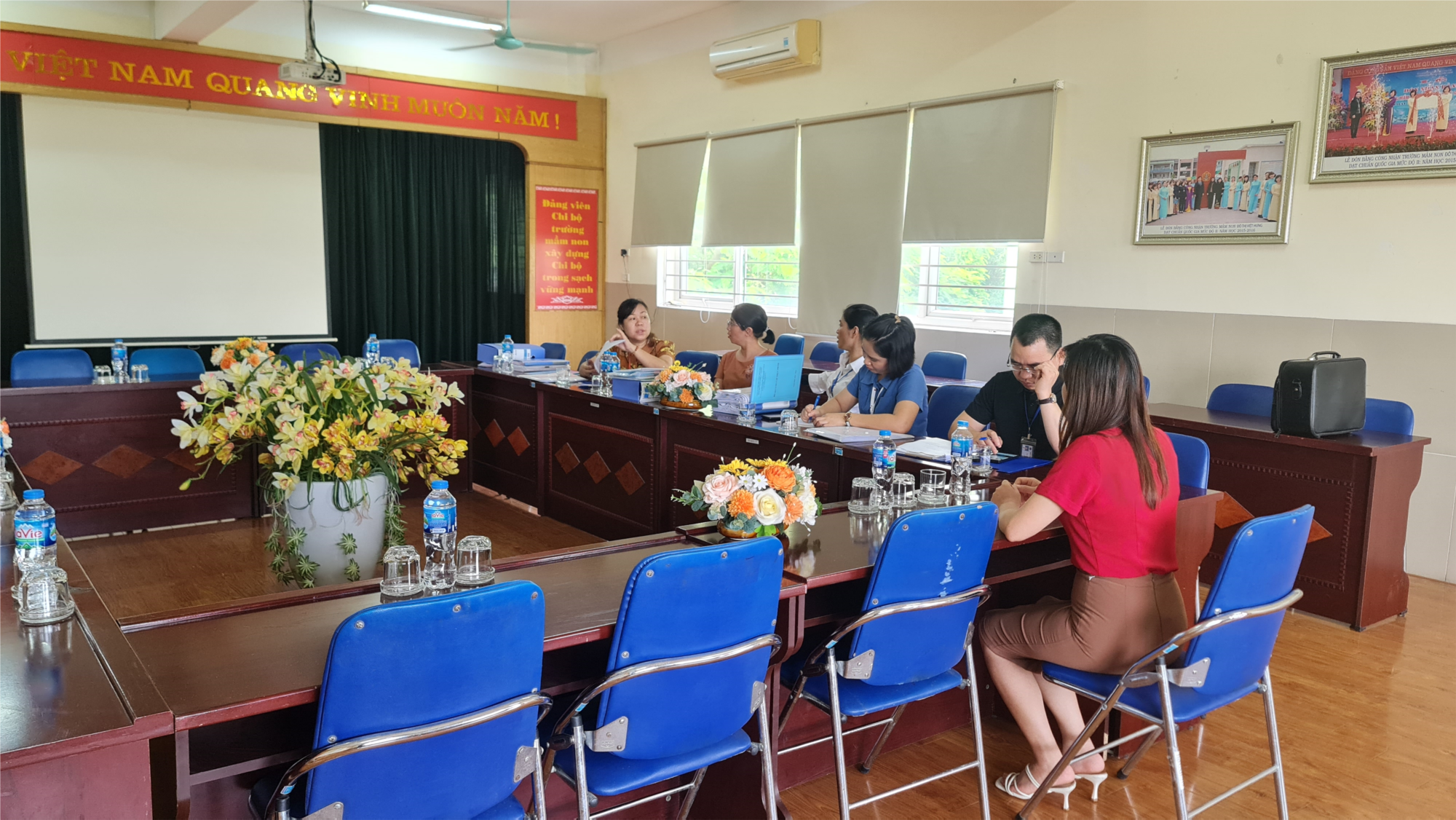 Đón đoàn kiểm tra có đ/c Trần Thị Hoàng Lâm – Hiệu trưởng nhà trường, các đ/c trong Ban giám hiệu và đ/c Nguyễn Thị Ánh Nguyệt - nhân viên y tế