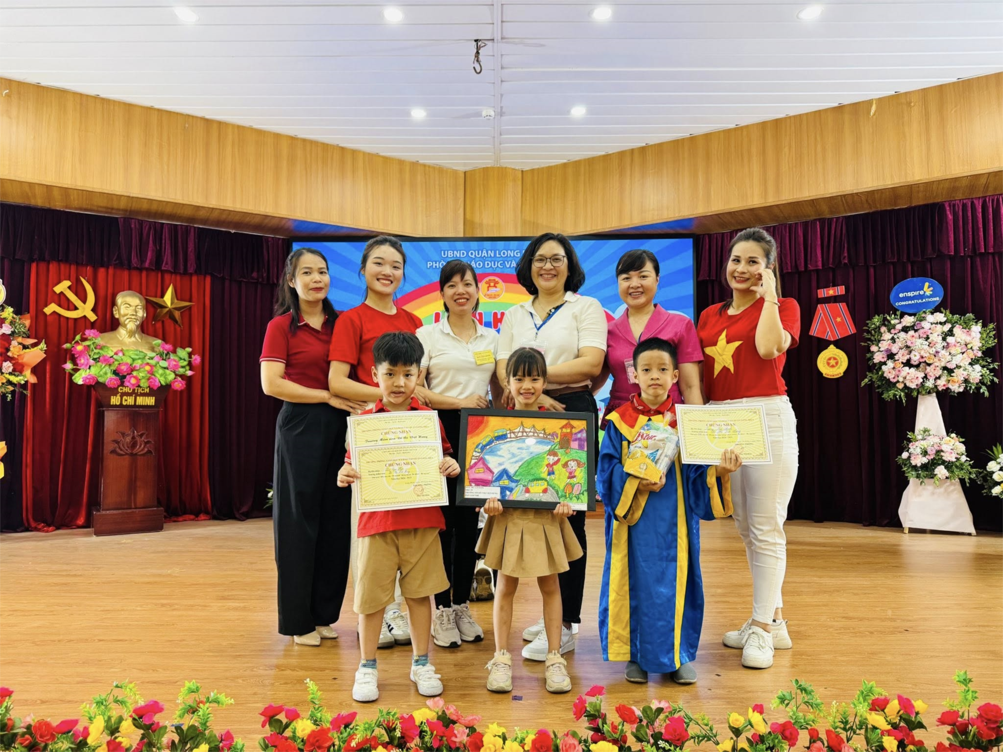 Đại diện các bé khối mẫu giáo lớn của trường, bạn Dương Đức Anh học sinh lớp A2 tham gia phần thi “Rung chuông vàng” và bé Dư Gia Hân tham gia thi vẽ tranh với chủ đề “Em yêu Long Biên”. Kết quả cuộc thi, hai bé đã xuất sắc đạt 2 giải Nhì.