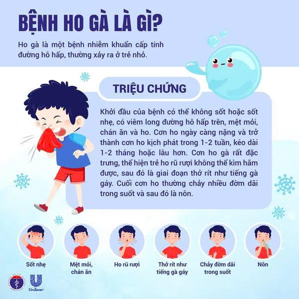 Cơn ho đặc trưng: trẻ ho rũ rượi, không thể kìm hãm, tiếp theo là thở rít như tiếng gà gáy, cuối cơn thường chảy nhiều đờm dãi trong suốt và nôn.
