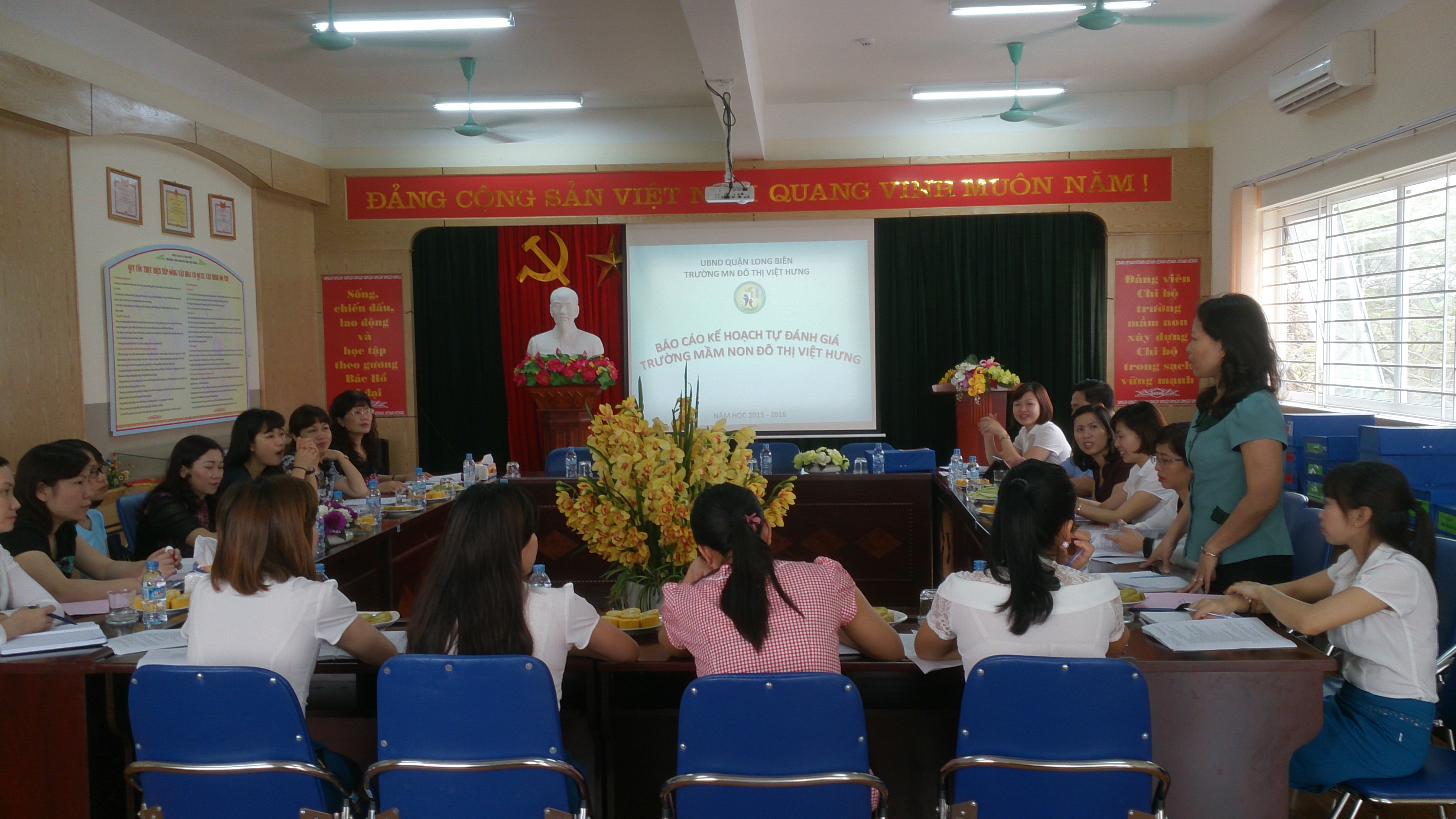 Đoàn đánh giá ngoài số 46 đã xem xét các báo cáo, hồ sơ sổ sách minh chứng theo 5 tiêu chuẩn được Cục Khảo thí và Kiểm định chất lượng trường học quy định. Sau khi kiểm tra hồ sơ sổ sách, Đoàn đã gặp gỡ và trao đổi phỏng vấn thực tế một số tiêu chí cùng giáo viên - nhân viên, phụ huynh học sinh, và BGH cùng các đoàn thể trong nhà trường.