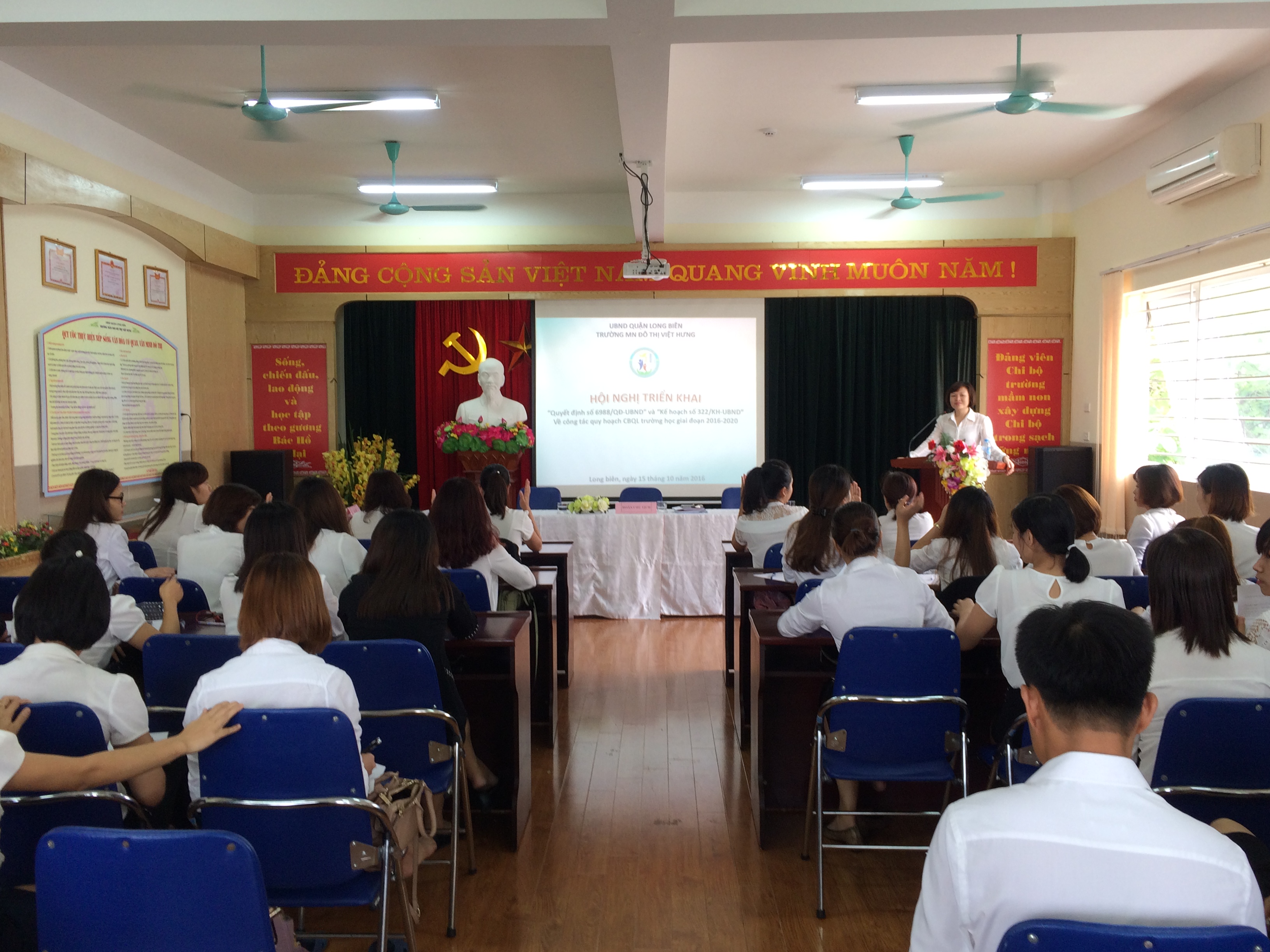 Sáng ngày 15/10/1016, dưới sự chủ trì của Đ/c Trần Thị Hoàng Lâm trường mầm non Đô Thị Việt Hưng đã tổ chức Hội nghị nhằm triển khai kế hoạch 322/KH-UBND và quyết định 6988/QĐ-UBND về việc quy hoạch cán bộ quản lý các trường mầm non công lập trực thuộc quận Long Biên giai đoạn 2016 – 2020. Tại hội nghị, đồng chí Trần Thị Hoàng Lâm đã phân tích rõ những quy định chung đối với việc quy hoạch; tiêu chuẩn, điều kiện đưa vào quy hoạch; quy trình xây dựng, quản lý và thực hiện quy hoạch để các cán bộ giáo viên, nhân viên trong trường nắm rõ quy trình và hiểu sâu hơn về vấn đề này.
