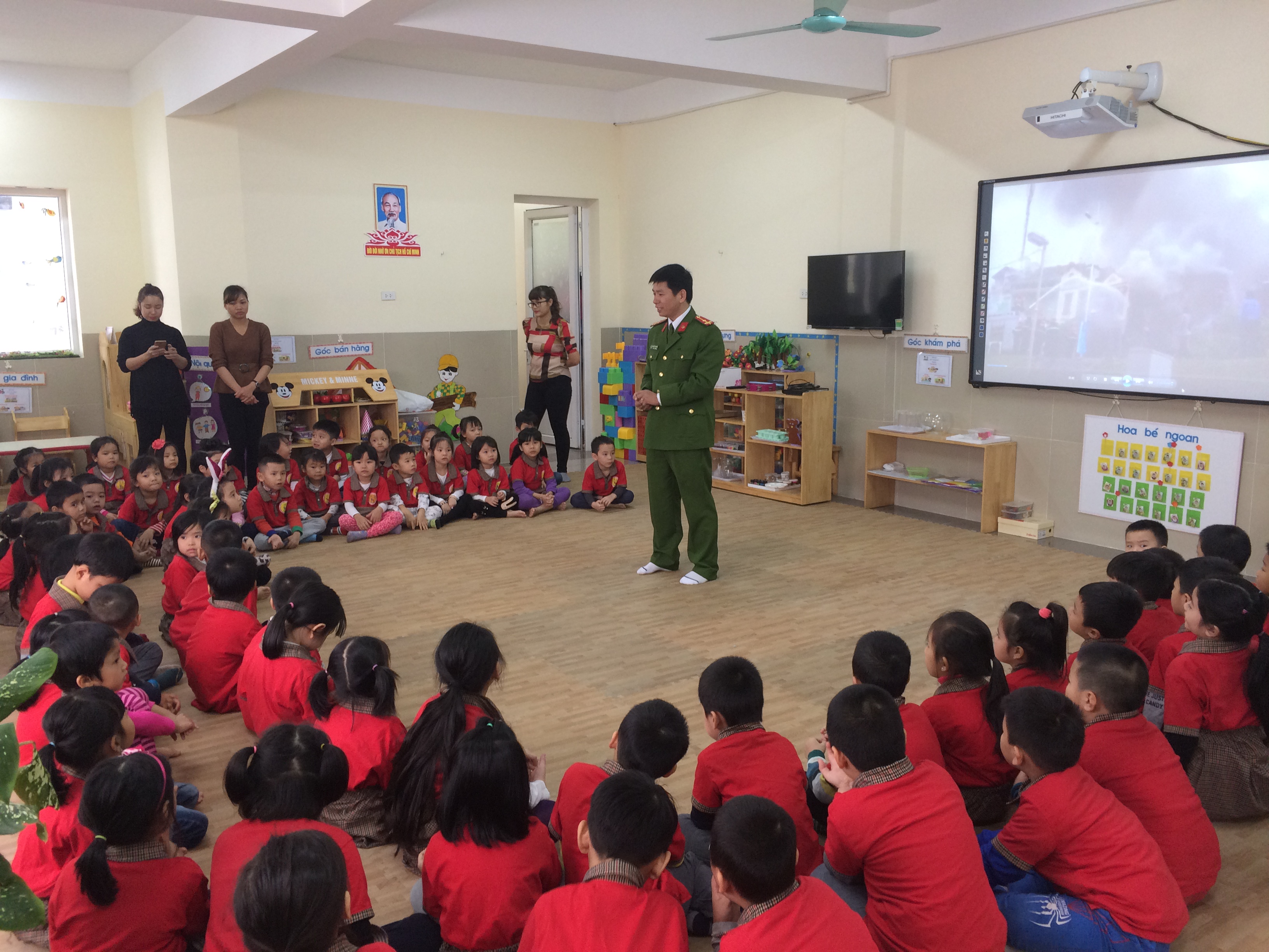 Trong buổi tập huấn, các bé đã được nghe chú Nguyễn Văn Mạnh – cảnh sát PCCC trò chuyện về những nguyên nhân xảy ra cháy nổ, xem những video clip về các tình huống khi xảy ra cháy nổ. Chú còn đưa ra những câu hỏi, cách xử lý khi đám cháy xảy ra. Đặc biệt trẻ còn được cung cấp kỹ năng di chuyển như thế nào để thoát ra khỏi đám cháy, và phải làm thế nào khi lửa cháy vào người. Các bé đã rất hào hứng, thể hiện sự mạnh dạn, tự tin trong giao tiếp và trò chuyện.