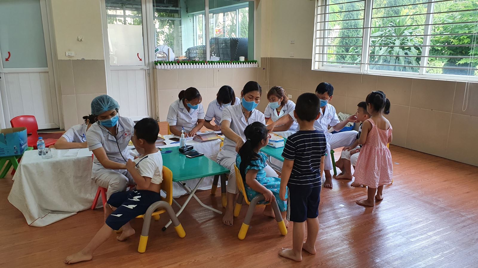 Thực hiện theo kế hoạch nhiệm vụ   !important;năm học 2020 – 2021 của Trường mầm non Đô Thị Việt Hưng, bộ phận y tế trường phối hợp với các bác sĩ của Trung tâm y tế Quận Long Biên tổ chức khám sức khỏe lần I cho 100% học sinh. Trong buổi khám, các bé đã được khám tất cả các chuyên khoa như: Tai, mũi, họng, răng hàm mặt, nghe tim, phổi, … Dưới sự hướng dẫn tận tình và sự chăm sóc chu đáo của ban giám hiệu, nhân viên y tế, và các giáo viên, các bé đều có tâm lí vô cùng thoải mái và hợp tác tốt với các bác sĩ trong quá trình khám sức khỏe. Bên cạnh đó các bé cũng được nghe các bác sỹ dặn dò và hướng dẫn cách vệ sinh răng miêng, cách rửa tay bằng xà phòng và cách giữ gìn chân tay sạch sẽ.