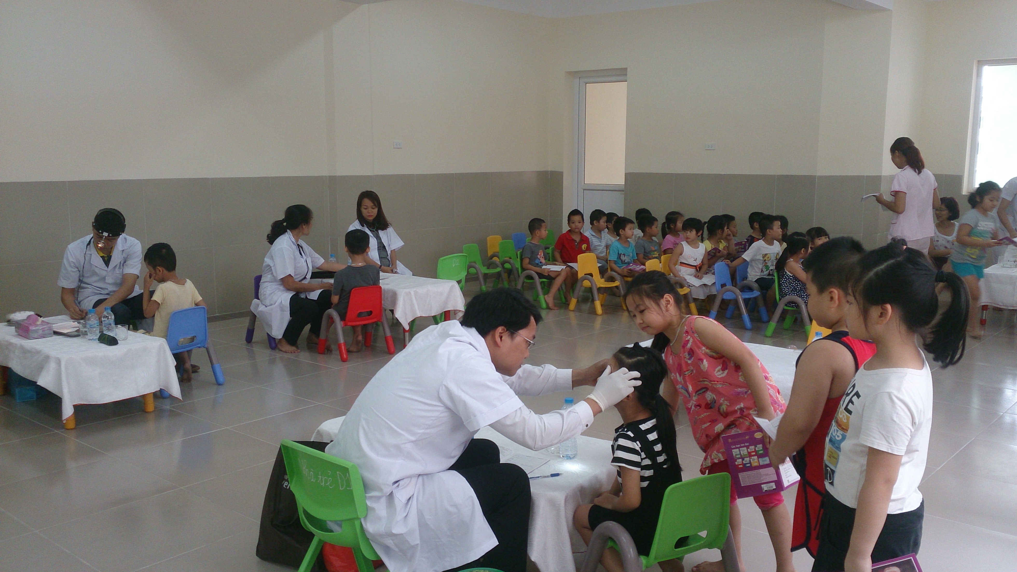 Ngay từ đầu giờ sáng các cô giáo đã nhanh chóng ổn định học sinh, cho xếp hàng lần lượt đến phòng khám. Tại phòng khám các bác sỹ chuyên khoa đã khám và tư vấn sức khỏe cho trẻ.