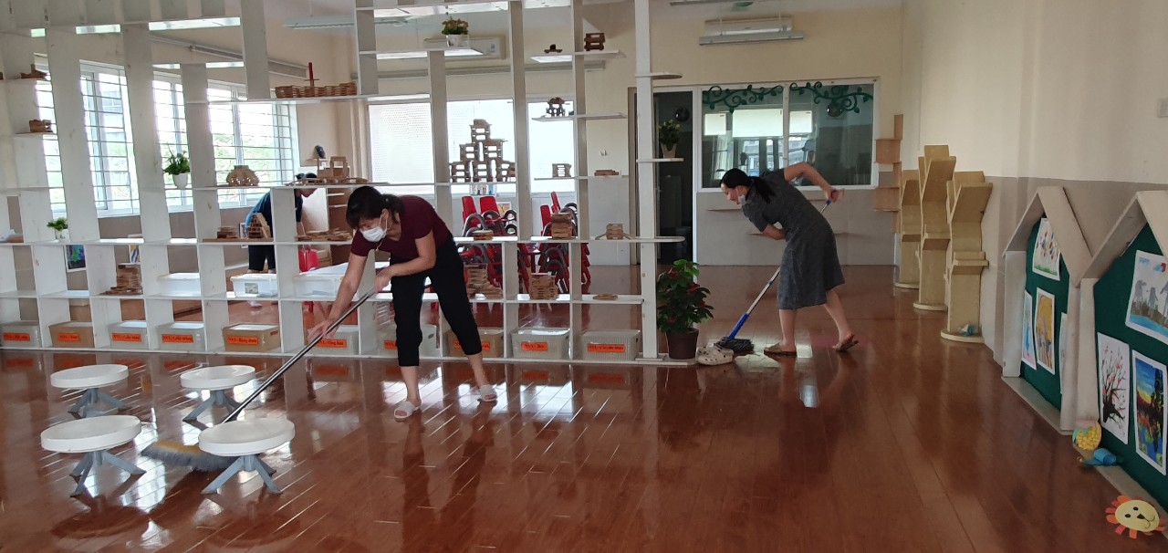 Khi thời tiết giao mùa chuyển giao là lúc các dịch bệnh có thể bùng phát như chân tay miệng, đau mắt đỏ, sốt xuất huyết…. Chính vì thế nhà trường luôn quan tâm và chú trọng để hạn chế tối đa việc dịch bệnh xuất hiện và lây lan trong trường. Sau khi tổ chức phun thuốc muỗi và diệt côn trùng, chiều ngày 31/03/2024, toản thể CBGVNV đã thực hiện tổng vệ sinh kỹ càng như: tẩy rửa, sát trùng, khử khuẩn toàn bộ các khu vực trong và ngoài lớp học đặc biệt là những đồ dùng đồ chơi, bàn ghế, giường, tay nắm cửa..., ngâm giặt khăn, chăn, vỏ gối bằng nước nóng, xà phòng…..Tiến hành thông thoáng toàn bộ lớp học, phát quang bụi rậm, khơi thông cống rãnh, thu gom rác thải đúng nơi quy định, lau chùi rửa đồ chơi ngoài trời…