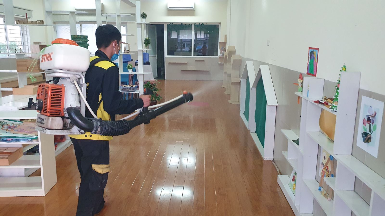 Việc phun thuốc muỗi được thực hiện cẩn thận, tất cả cá !important;c khu vực trong và ngoài lớp học như: nhà vệ sinh, hiên chơi, phòng kho, hành lang, các góc hướng nghiệm.... đều được phun kĩ lưỡng. Các phòng chức năng, nhà bếp cũng được phun đảm bảo diệt trừ muỗi và các côn trùng gây hại.