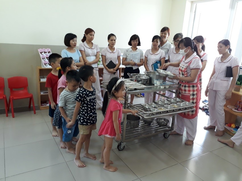 Bên cạnh chất lượng giáo dục – giảng dạy, việc tổ chức bữa ăn cho trẻ ở các trường mầm non là vấn đề quan trọng và cũng là điều phụ huynh quan tâm nhiều nhất. Thường trong các bữa ăn của trẻ, giáo viên mới chỉ chú ý làm sao cho trẻ ăn hết xuất và ăn ngon miệng chứ chưa đi sâu đến vấn đề tập cho trẻ kĩ năng sống và nhất là kĩ năng tự lập, tự phục vụ. Hiểu rõ được tầm quan trọng cùng những trăn trở đó của phụ huynh, trường mầm non Đô thị Việt Hưng không ngừng quan tâm, củng cố, đi sâu vào vấn đề rèn luyện kĩ năng sống cho trẻ. Từ năm học 2017-2018 trường mầm non Đô thị Việt Hưng bắt đầu triển khai tổ chức hình thức ăn bằng khay cho các bé khối mẫu giáo nhỡ và mẫu giáo lớn.