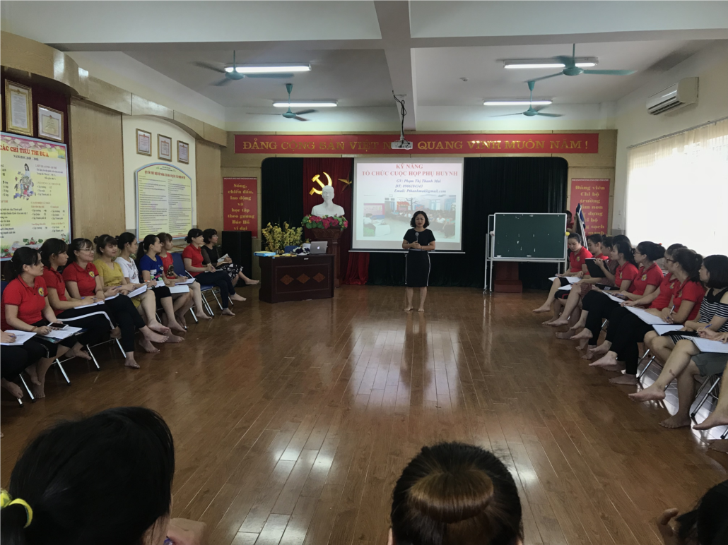 Nắm được sự trăn trở ấy, trường mầm non Đô thị Việt Hưng đã tổ chức buổi tập huấn chuyên đề “Kỹ năng tổ chức cuộc họp phụ huynh” do giảng viên Thạc sĩ Phạm Thị Thanh Mai – Trưởng bộ môn Khoa học cơ sở công tác xã hội Học viện thanh thiếu niên Việt nam - Cán bộ Trung tâm giáo dục kỹ năng sống Văn hóa Việt giảng bài. Đây thực sự là những chuyên đề vô cùng lý thú, bổ ích đối và hết sức thiết thực đối với các CBGVNV của nhà trường. Giáo dục liên tục cập nhật cái mới, vận hành không ngừng nghỉ nhằm đáp ứng nhu cầu bức thiết của thời đại là lẽ tất nhiên. Và cách tổ chức một cuộc họp phụ huynh cũng vậy. Để những cuộc họp phụ huynh thực sự phát huy hiệu quả, cần phải cải tiến và đổi mới hình thức tổ chức. Thay vì việc truyền tải thông tin 1 chiều từ phía nhà trường và giáo viên tới phụ huynh, thay vì 1 buổi họp khô cứng với những nội dung mang tính hình thức thì dưới sự chia sẻ và hướng dẫn của giảng viên, buổi họp phụ huynh có thể hướng tới những hình thức đổi mới, sáng tạo nhằm lôi cuốn, cuốn hút phụ huynh cùng đồng hành, cùng tham gia với giáo viên vào trong quá trình chăm sóc và giảng dạy cho trẻ.