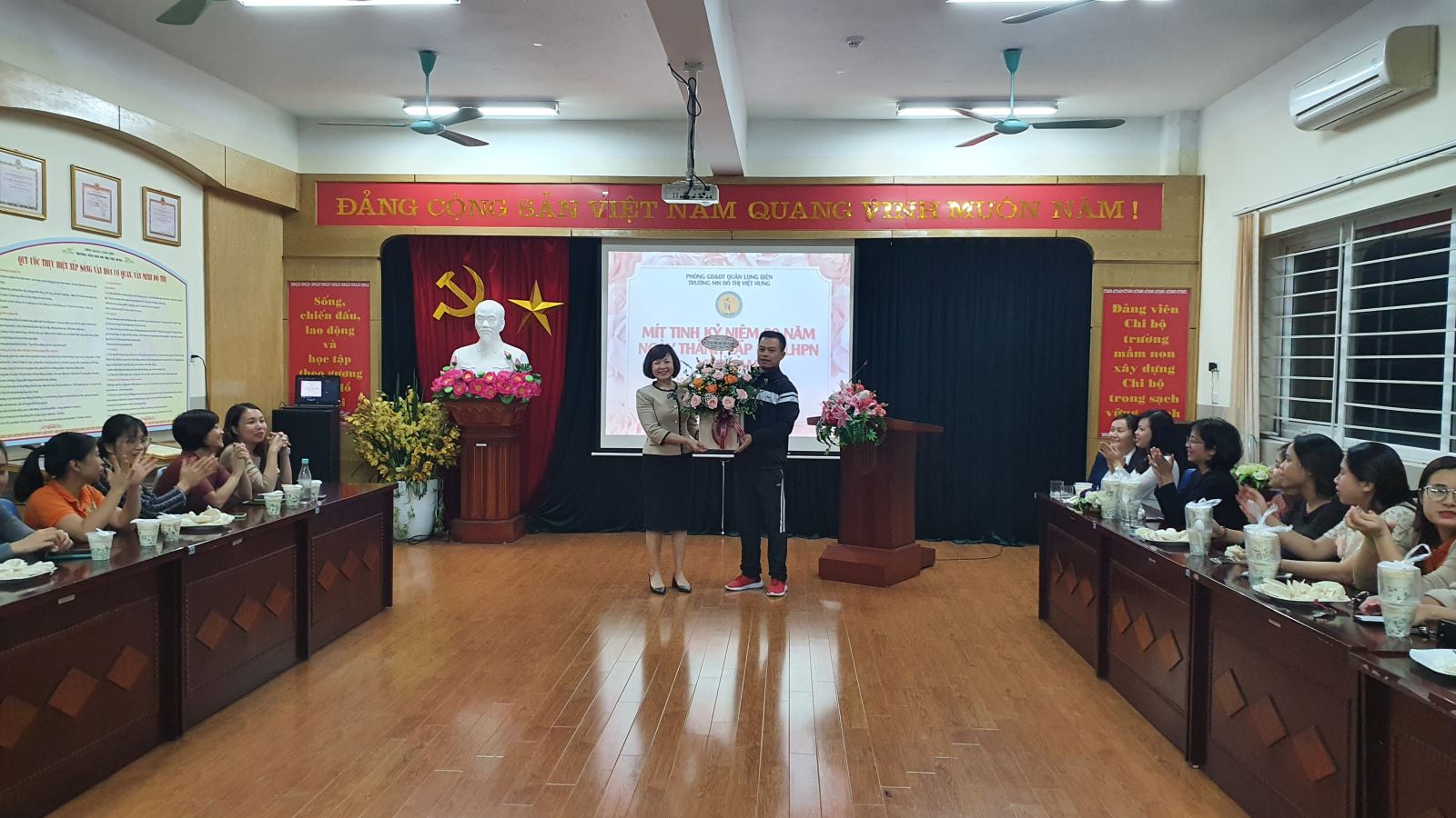 Được sự nhất trí !important; của chi bộ, BGH nhà trường, BCH Công đoàn trường MN Đô Thị Việt Hưng đã long trọng tổ chức buổi mít tinh kỷ niệm lần thứ 90 ngày thành lập Hội Liên hiệp Phụ nữ Việt Nam. Tới dự buổi mít tinh có đồng chí Trần Thị Hoàng Lâm – Bí thư chi bộ - Hiệu trưởng nhà trường. Cùng với đó là sự có mặt của các đồng chí trong BGH, các đồng chí trong Ban chấp hành công đoàn và toàn thể các CBGV-NV.