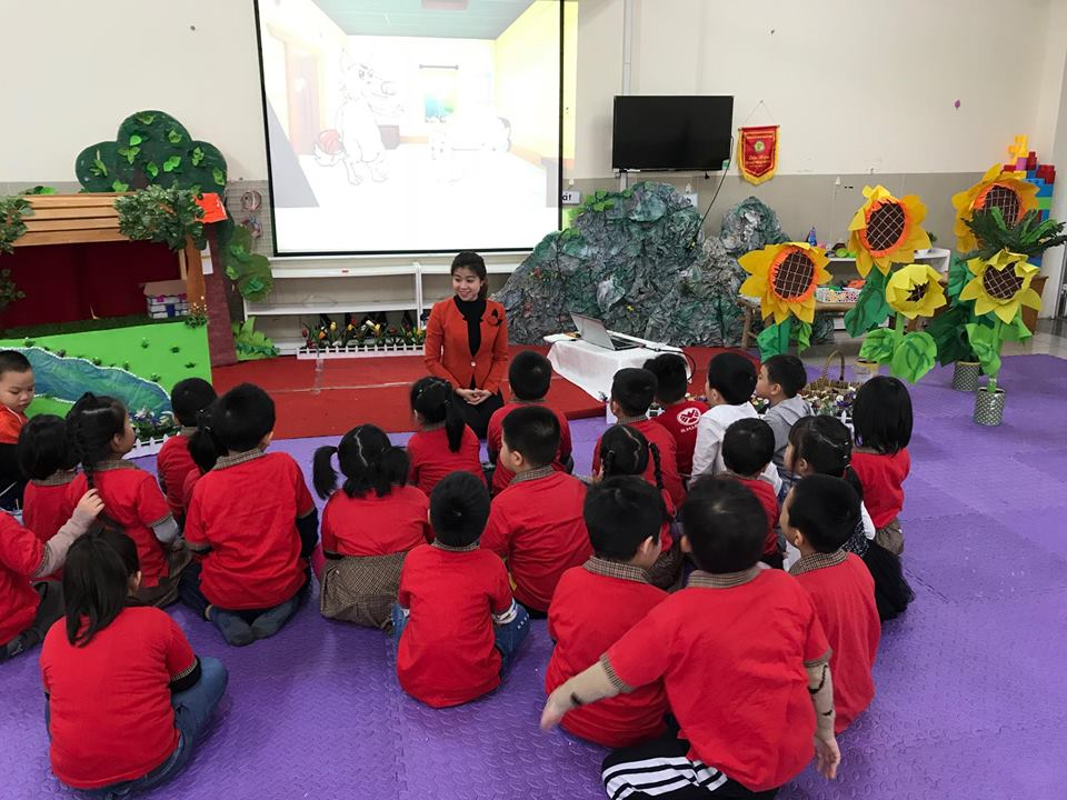 Sau khi được nghe cô kể chuyện, các cô sẽ đàm thoại với các bé để hiểu rõ nội dung câu chuyện hơn. Tiếp đó, các bé được nghe cô giới thiệu nhóm chơi và chuẩn bị về nhóm.