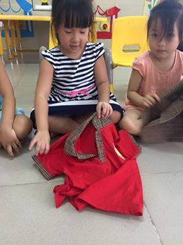 Chúng con đang say sưa học cách gấp quần áo đấy ạ!