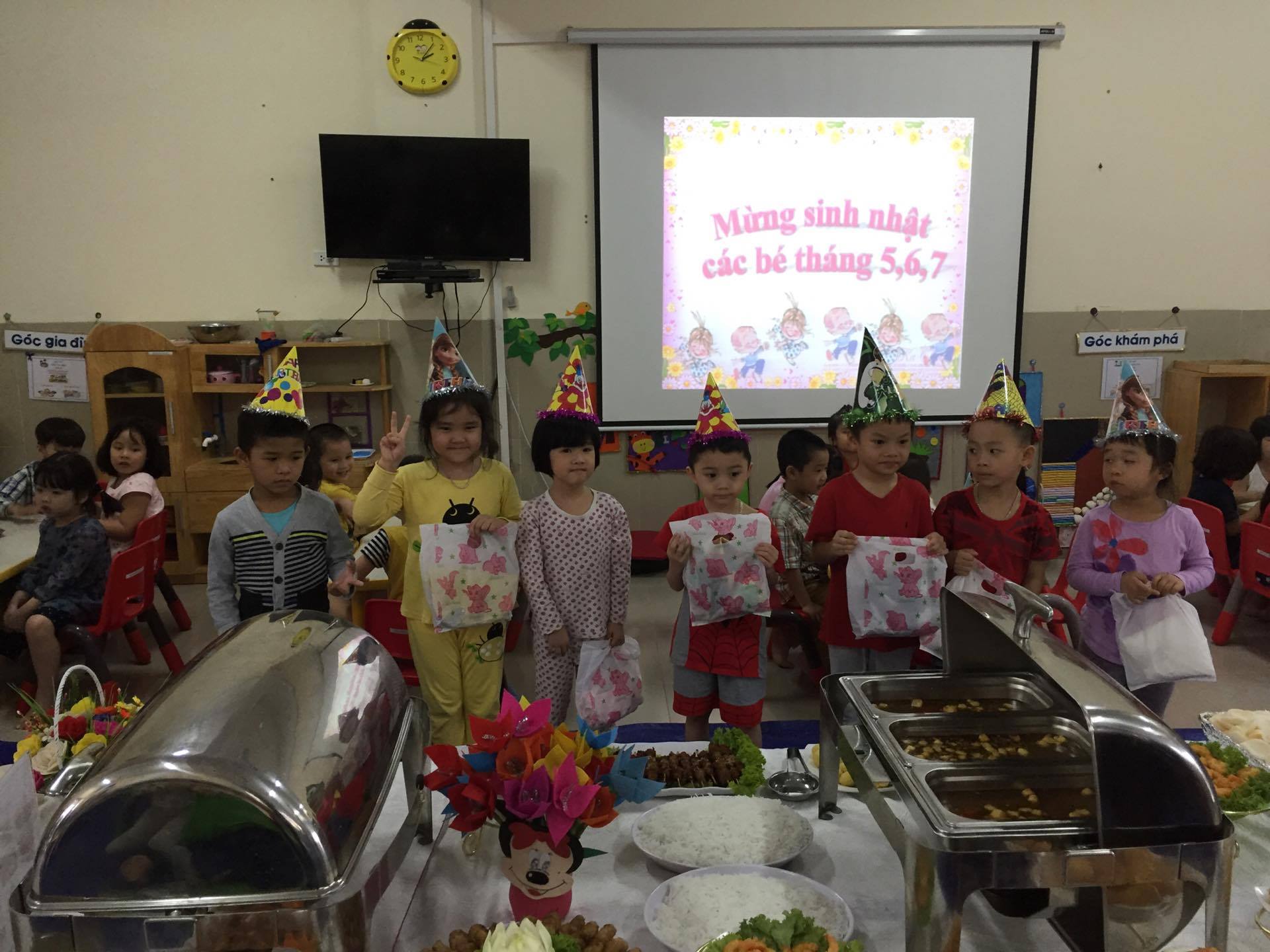 Các bé nhận quà sinh nhật trước khi ăn tiệc