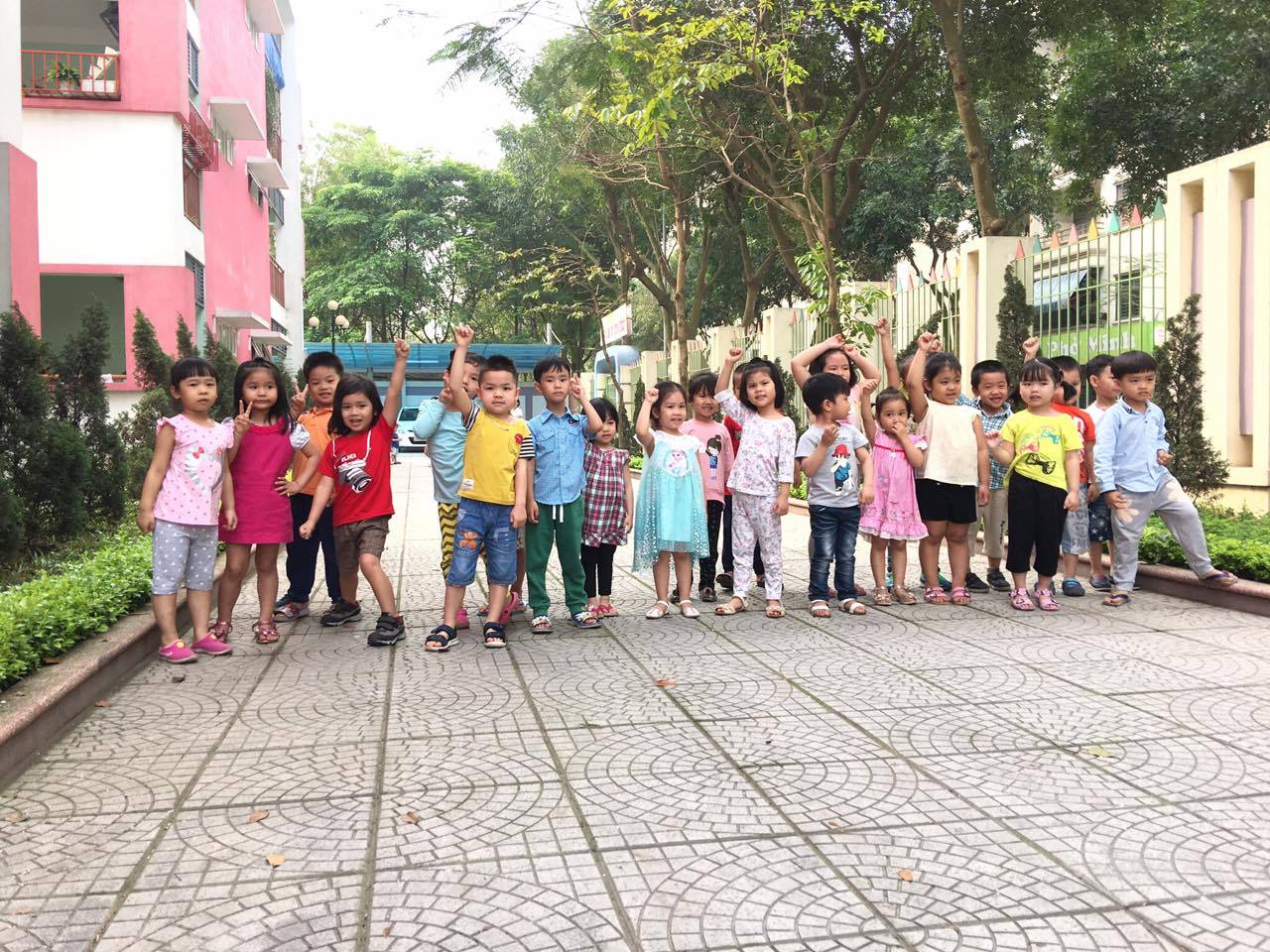 Các bé của hai lớp cùng nhau xếp hàng ra sân chơi và hoạt động.