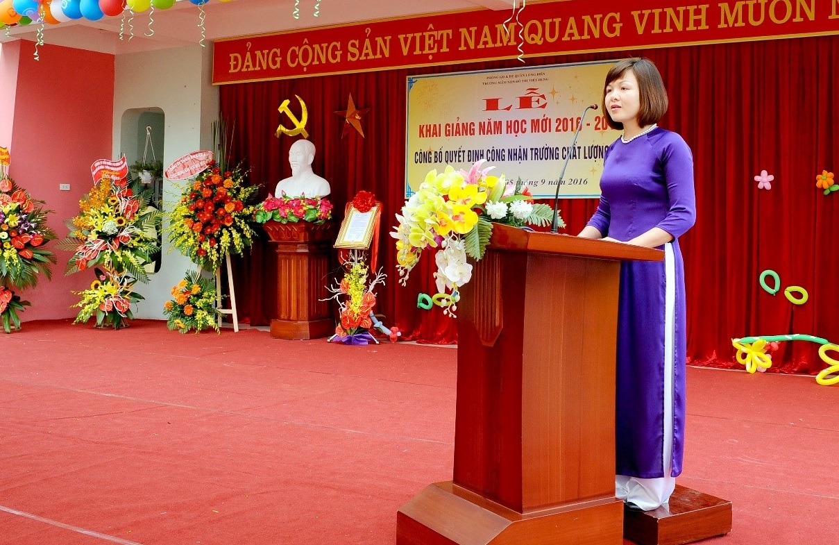 Trường mầm non Đô Thị Việt Hưng được thành lập tháng 10/2014 theo đề án số 800/ĐA-UBND ngày 17/4/2014 của UBND quận Long Biên. Một ngôi trường mới, và một mô hình mới đòi hỏi người quản lý phải có bản lĩnh, tận tụy, năng động và sáng tạo để đứng đầu dẫn dắt tập thể. Mặc dù được các cấp lãnh đạo quận Long Biên quan tâm và tạo điều kiện hết sức,xong với một ngôi trường mới thì khó khăn cũngrất nhiều. Là người lãnh đạo, chị luôn trăn trở suy nghĩ, tìm cách khắc phục. Chị chủ động tham mưu với cấp ủy Đảng, chính quyền địa phương về biện pháp phát triển giáo dục mầm non, mặt khác, chị tranh thủ sự quan tâm của ban lãnh đạo phòng giáo dục và các ban, ngành, đoàn thể huy động mọi nguồn lực tập trung xây dựng cơ sở vật chất nhà trường. Là người “Hiệu Trưởng năng động”, chị không chỉ góp phần nâng cao chất lượng giáo dục mà chị còn vận động cán bộ giáo viên, các đoàn thể, doanh nghiệp cùng chung tay xây dựng cảnh quan của trường, làm cho diện mạo của ngôi trường ngày một khang trang, sạch đẹp.