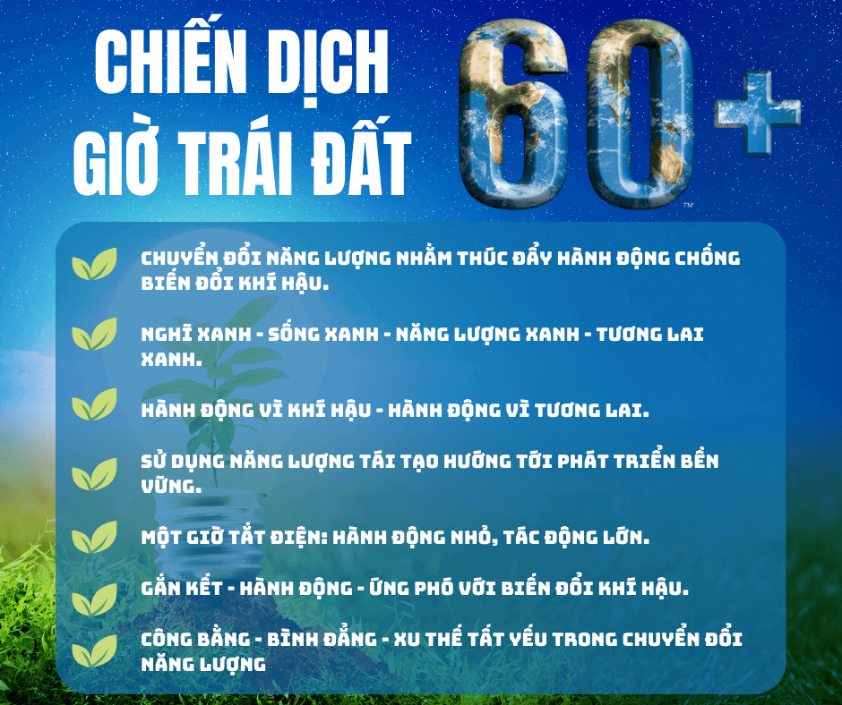 Chiến dịch Giờ trái đất 2024 có thông điệp chính là “Giảm dấu chân Carbon – Hướng tới Net Zero”, Thông điệp này nhấn mạnh vai trò quan trọng trong hành trình hướng tới Net Zero, đồng thời kêu gọi các quốc gia cùng hướng tới một nền kinh tế xanh, kinh tế tuần hoàn, phát triển bền vững trong đó áp dụng các giải pháp dựa vào thiên nhiên, mở rộng các hành lang đa dạng sinh học, các khu bảo tồn; giảm thiểu phát thải; chuyển đổi năng lượng tái tạo trong các lĩnh vực; đổi mới sáng tạo khoa học công nghệ nhằm giảm áp lực lên môi trường tự nhiên