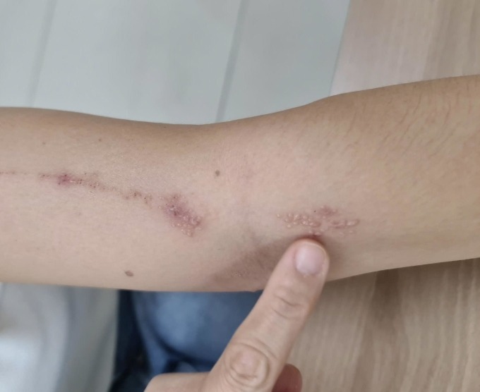 Vết thương trên tay của trẻ bị viêm da tiếp xúc do kiến ba khoang. Ảnh: Anh Thư