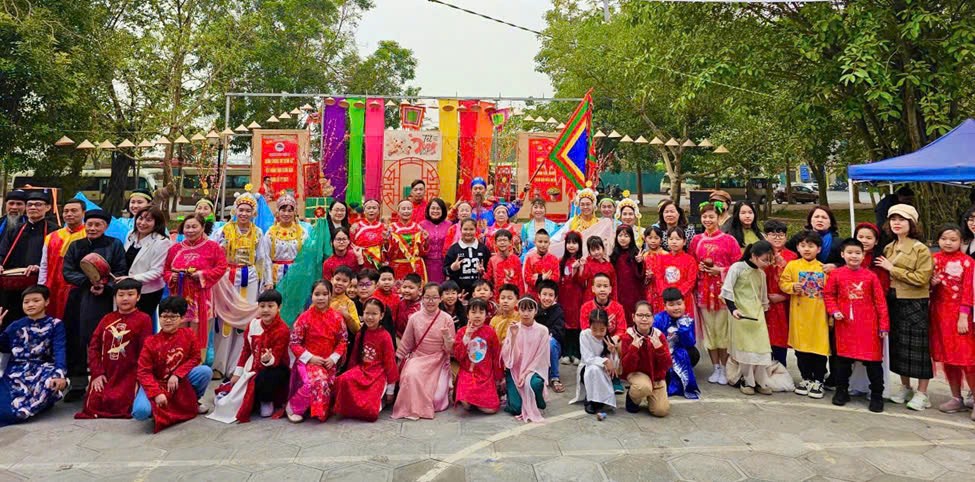 Học sinh tham gia giao lưu tại đình làng Lệ Mật