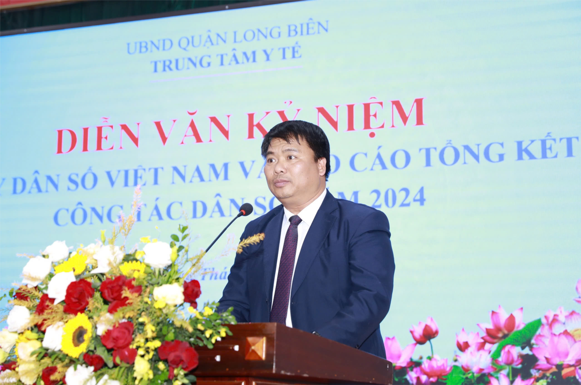 Hội nghị được nghe ông Nguyễn Khắc Thuý – Phó Giám đốc Trung tâm Y tế quận trình bày diễn văn kỷ niệm Ngày Dân số Việt Nam gắn với tổng kết công tác Dân số năm 2024. Theo đồng chí, Nghị quyết số 21/NQ-TW của Hội nghị lần thứ sáu Ban chấp hành Trung ương Đảng khóa XII đã định hướng cho chính sách dân số Việt Nam trong thời gian tới là:"Tiếp tục chuyển trọng tâm chính sách dân số từ kế hoạch hoá gia đình sang dân số và phát triển. Công tác dân số phải chú trọng toàn diện các mặt quy mô, cơ cấu, phân bố, đặc biệt là chất lượng dân số và đặt trong mối quan hệ hữu cơ với các yếu tố kinh tế, xã hội, quốc phòng, an ninh và bảo đảm phát triển nhanh, bền vững". Trong năm qua, bám sát định hướng về Dân số và phát triển của Thành phố, các hoạt động về Dân số quận Long Biên đã được các cấp ủy Đảng, chính quyền từ quận đến cơ sở quan tâm triển khai đồng bộ và đạt được kết quả đáng khen ngợi. Các chỉ tiêu giao về giảm sinh, giảm sinh con thứ ba trở lên, kế hoạch hoá gia đình và nâng cao chât lượng dân số trên địa bàn quận đều đạt và vượt kế hoạch Thành phố và Quận giao, cụ thể: Tổng số sinh năm 2024 là 4.480 trẻ, bằng so với năm 2023; có 99 trẻ sinh là con thứ ba trở lên, giảm 0,08% so với kế hoạch giao năm 2024; tư vấn và sàng lọc trước sinh đủ 4 bệnh cho 4540 bà mẹ mang thai trên tổng số 5036 bà mẹ mang thai trên 11 tuần, đạt tỷ lệ 90.2%, đạt 101.3% kế hoạch giao; tư vấn và sàng lọc sơ sinh đủ 5 bệnh cho 4266 trẻ trên tổng số 4480 trẻ sinh ra, đạt tỷ lệ 95,2%, đạt 102,4% kế hoạch giao năm 2024…